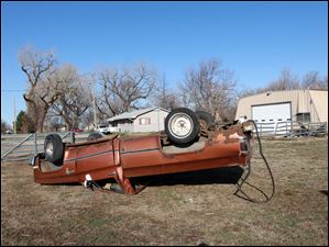 A Chevy pickup sits overturned after a tornado struck the residence in rural Reno County, near Hutchinson, Kan.
