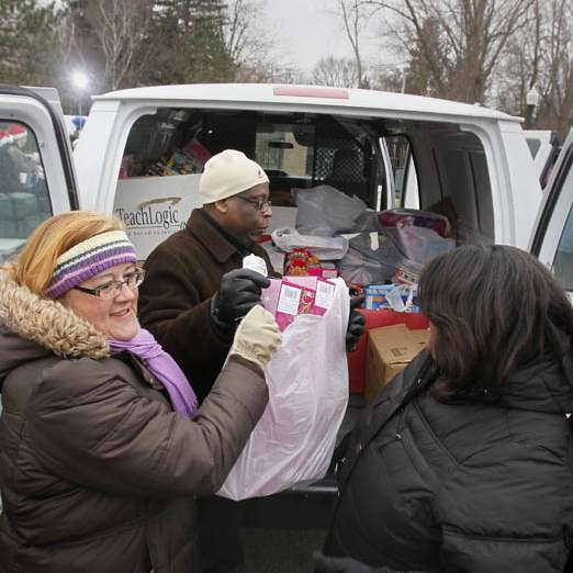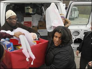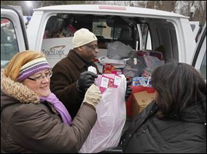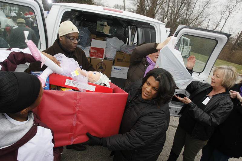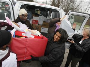 Karen Farrell, with the Toledo Zoo, left, Michael Alexander, the labor liaison for the United Way, and Scott High School principal Treva Jeffries, unload a van packed with toys.
