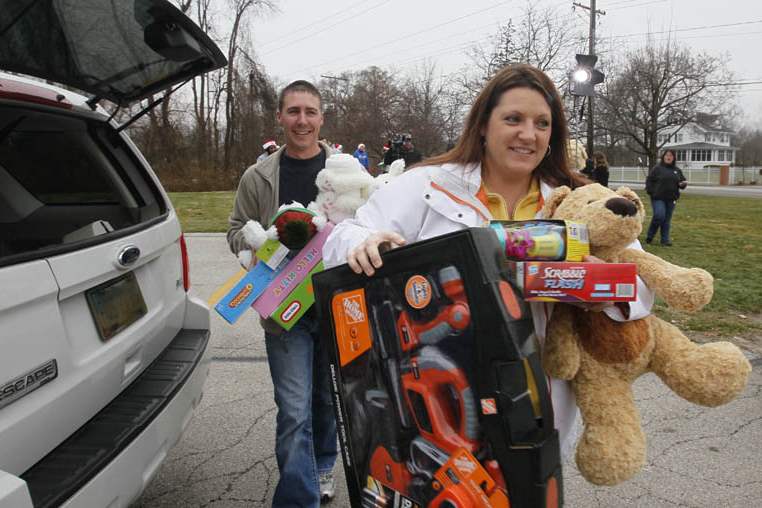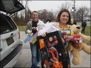 Ben, rear and left, and Tiffany Decker, of Maumee, carry their donations for the toy drive.