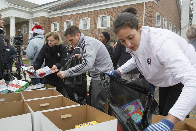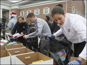 Bowling Green State University Women's basketball team coach Jennifer Roos, left, and assistant coaches Jesse Fleming, center, and Sahar Nusseibeh, sort toys donated at the event.