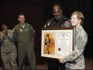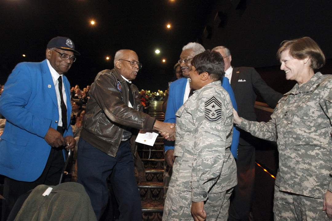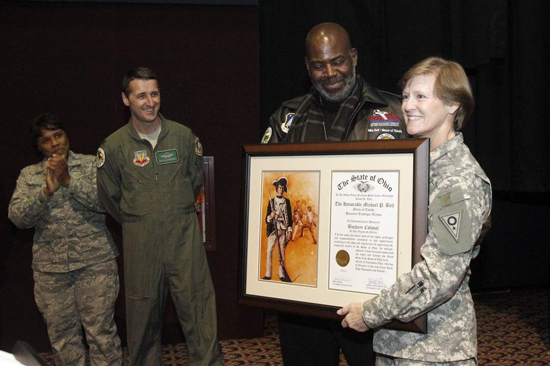 Mayor Mike Bell receives a plaque from Maj. Gen. Deborah A. Ashenhurst, right, before the special viewing of the movie 'Red Tails' at the Rave at Westfield Franklin Park Mall. Command Chief Master Sgt. Tamara Phillips, far left, and Col. Steve Nordhaus, 180th FW Commander, center, look on.