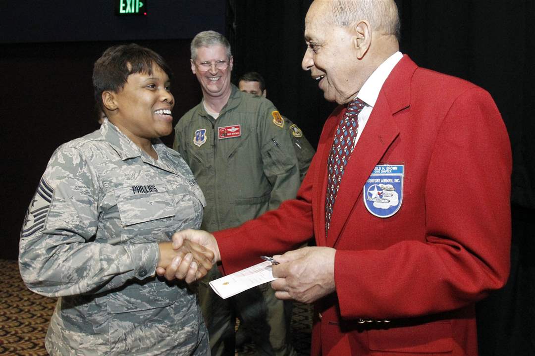 Command Chief Master Sgt. Tamara Phillips Tamara Phillips, left, congratulates Rt. Lt. Col. Harold Brown, right, before the special viewing of the movie 'Red Tails.' Brig. Gen. Mark Bartman, center, looks on.