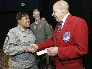 Tuskegee Airmen Frederick Henry Sr, left, Lt. Col. Alexander Jefferson, center, and Jesse Rutledge, right, are "coined" and receive congratulations from Command Chief Master Sgt. Tamara Phillips, front right, and Maj. Gen. Deborah A. Ashenhurst.