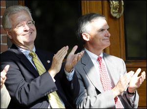 State Representative Rex Damschroder, left, and Representative Bob Latta (R - OH), applaud during the launch ceremony. While children could get one of 500 available Hayes coins for free, adults had the opportunity to exchange bills for the new mints.