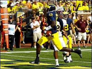 Michigan's Jeremy Gallon catches a touchdown pass in front of Central Michigan's Dennis Nalor.