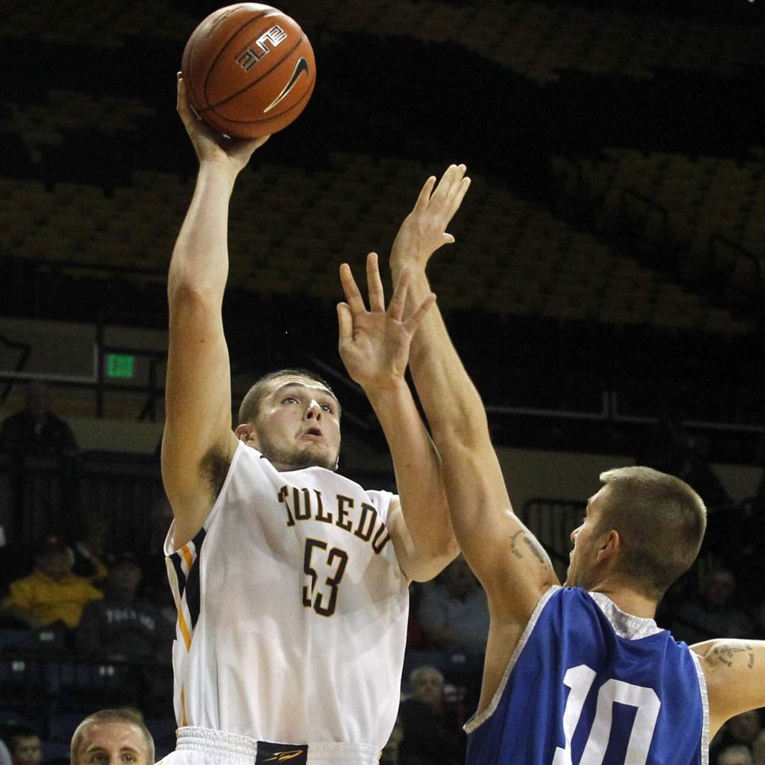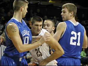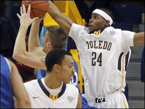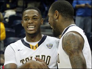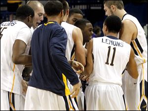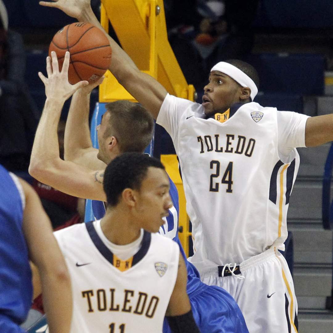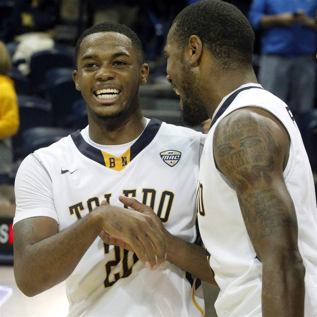 University of Toledo's Julius Brown, center, is surrounded by teammates after making the winning shot.