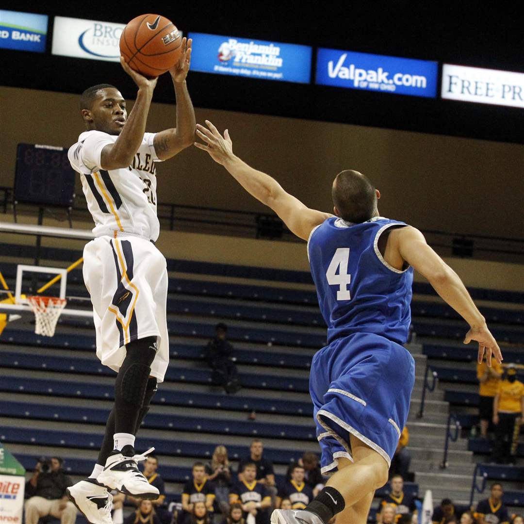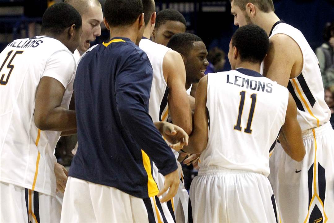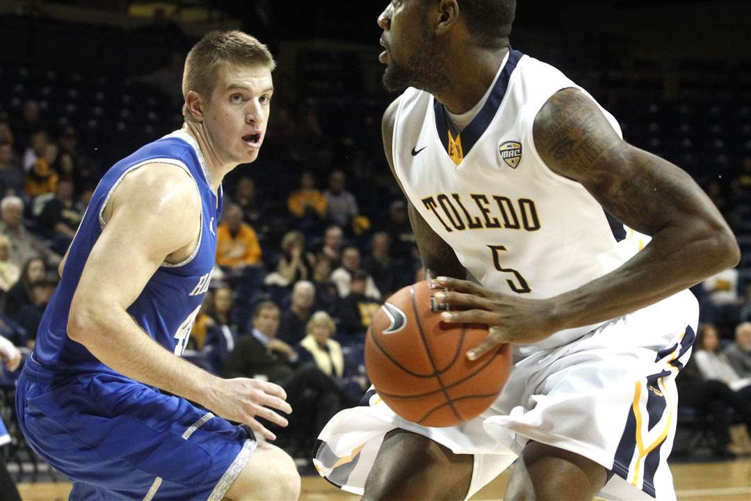 University of Toledo's Julius Brown, center, is surrounded by teammates after making the winning shot.