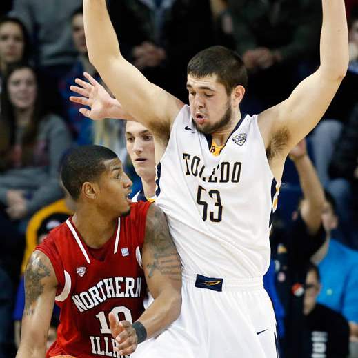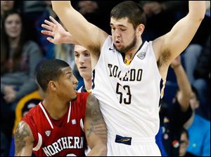 University of Toledo center Nathan Boothe (53) shoots against Northern Illinois forward Darrell Bowie (10).