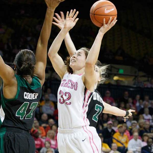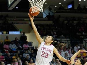Stephanie Recker driving toward the basket in the first half. Recker, a junior, was playing her first game after being out for 16 games recovering from a back injury.