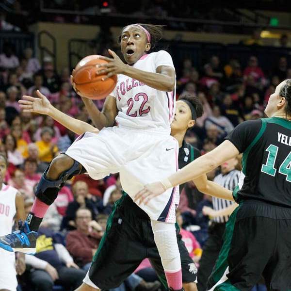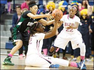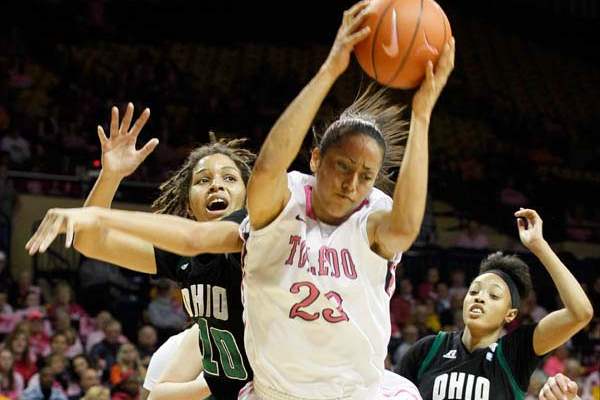 UT's Andola Dortch flying past OU defenders Quiera Lampkins (5), rear, and Kat Yelle (14).