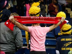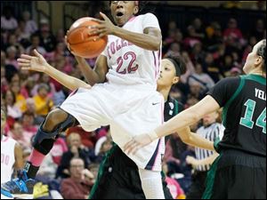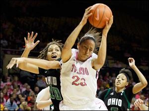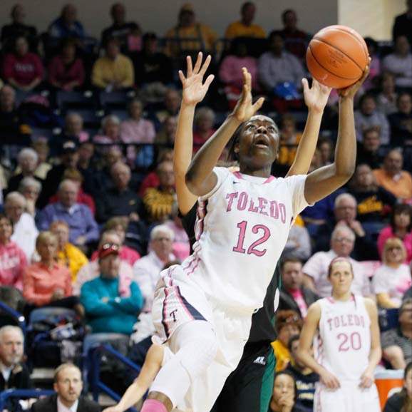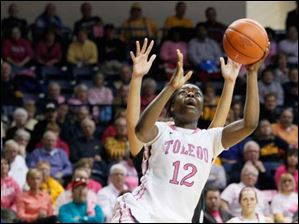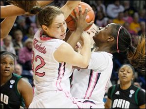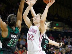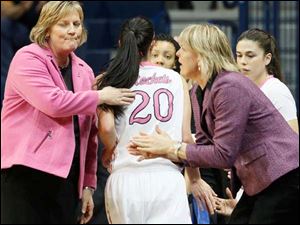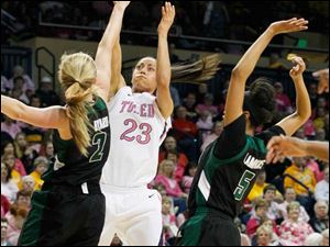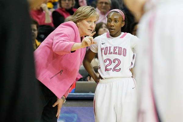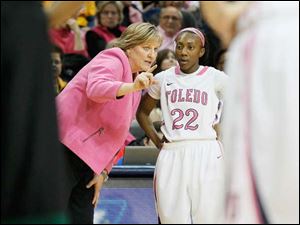 SPT UTW16 UT head coach Tricia Cullop, left, and associate head coach Vicki (cq) Hall congratulate Stephanie Recker as she come off the court in the first half. Recker, a junior, was playing her first game after being out for 16 games recovering from a back injury. The University of Toledo Women's basketball team (11-11, 6-5) hosts Ohio University (8-14, 3-8 MAC) at home in Toledo, Ohio on February 15, 2014. The Blade/Jetta Fraser