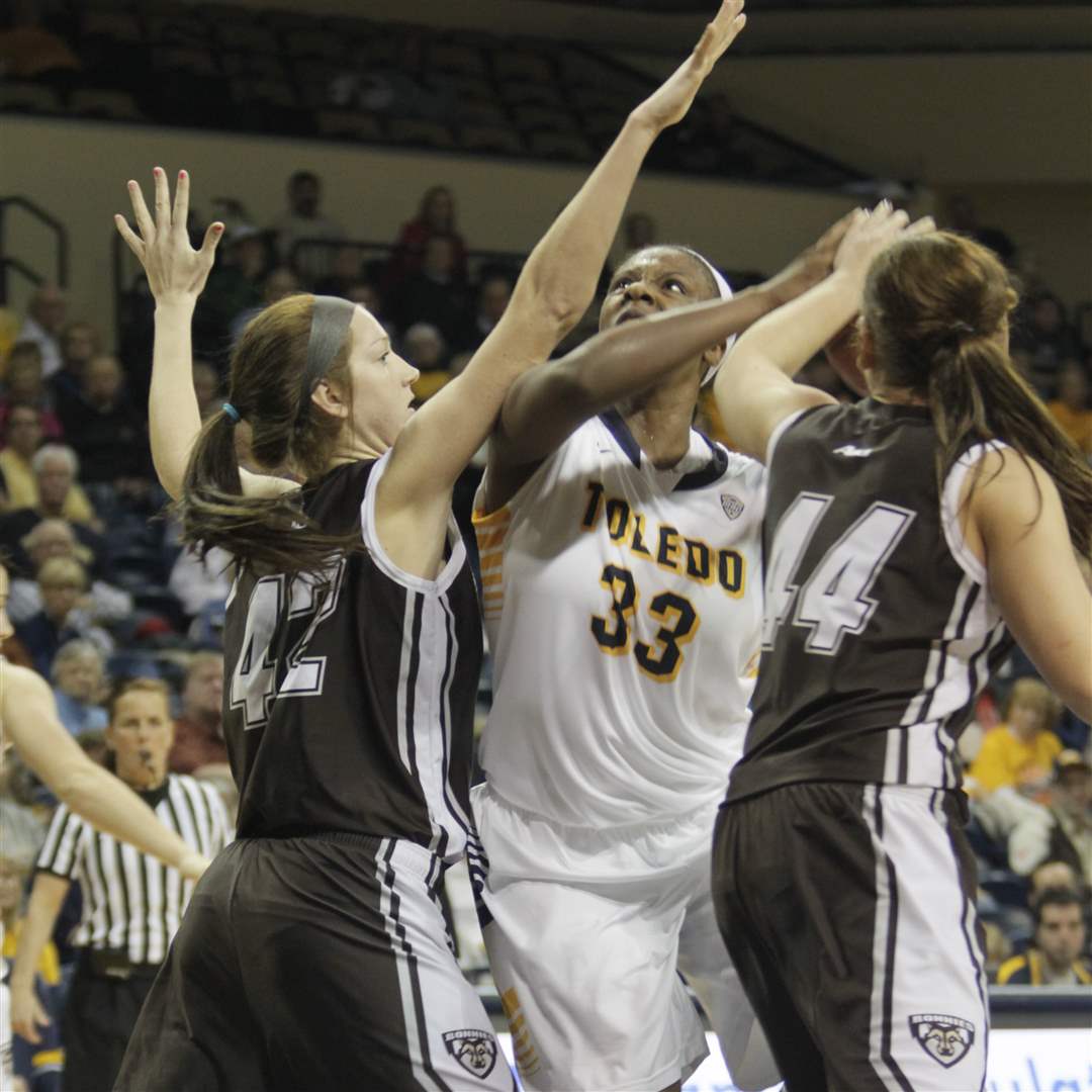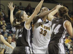 Toledo's Yolanda Richardson blocks a shot by St. Bonaventure's Alaina Walker.