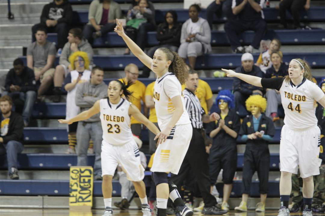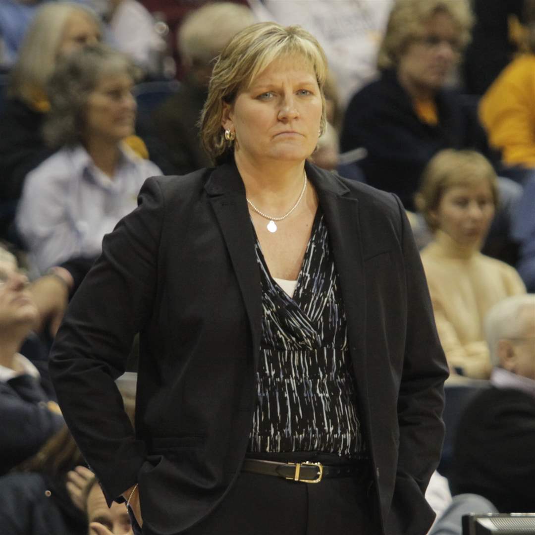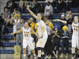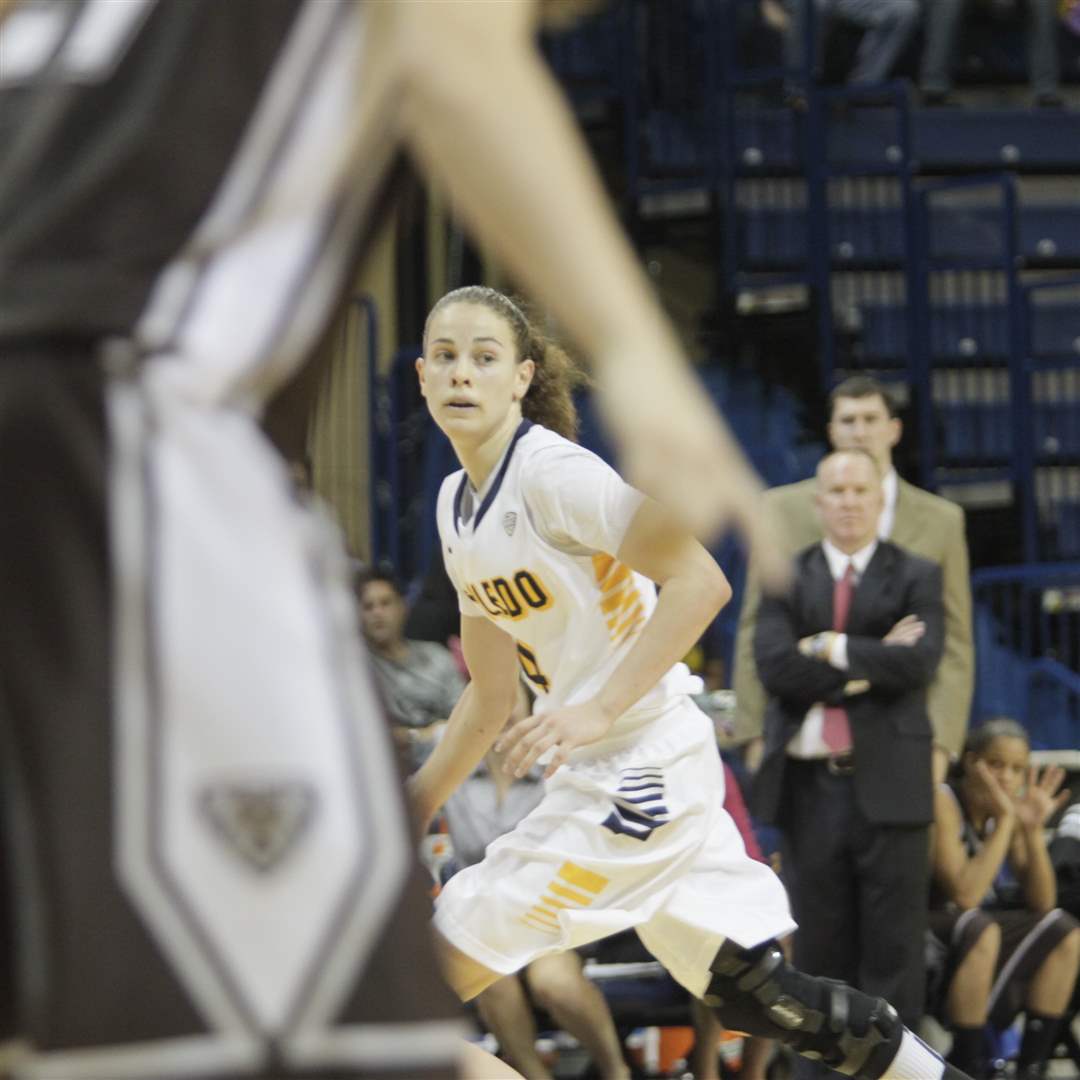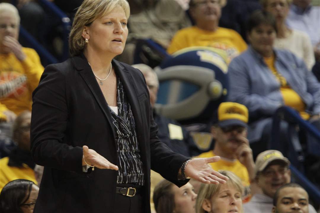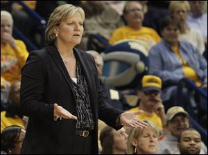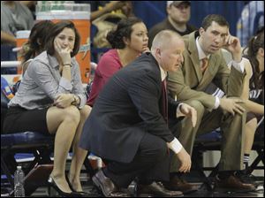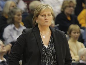 Toledo coach Tricia Cullop talks with officials after one of her players is called for an offensive charge.