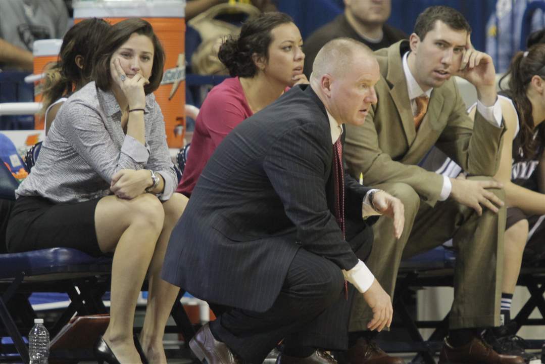 The St. Bonaventure coaching staff, from left, assistant coaches Kate Achter and Andrea Doneth, head coach Jim Crowley, and assistant coach Ryan Gensler. Achter, a graduate of Clay High School in Oregon, was an All-American point guard at Bowling Green.