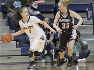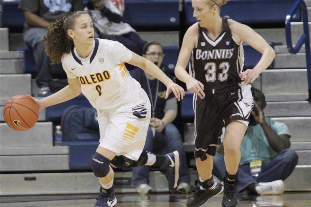 Toledo's Inma Zanoguera, left, shoots over St. Bonaventure's Hannah Little.