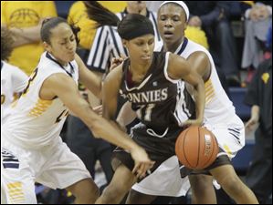 Toledo's Inma Zanoguera, left, and teammate Yolanda Richardson, right, defend St. Bonaventure's Hannah Little.