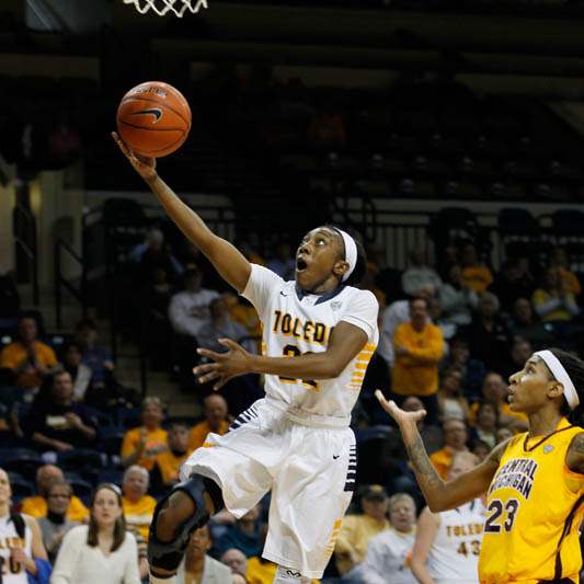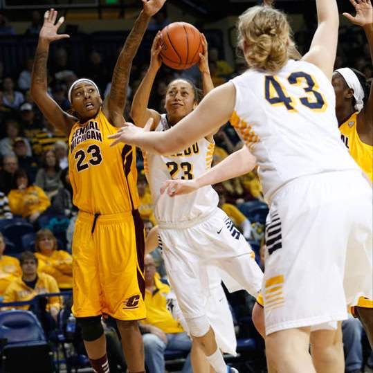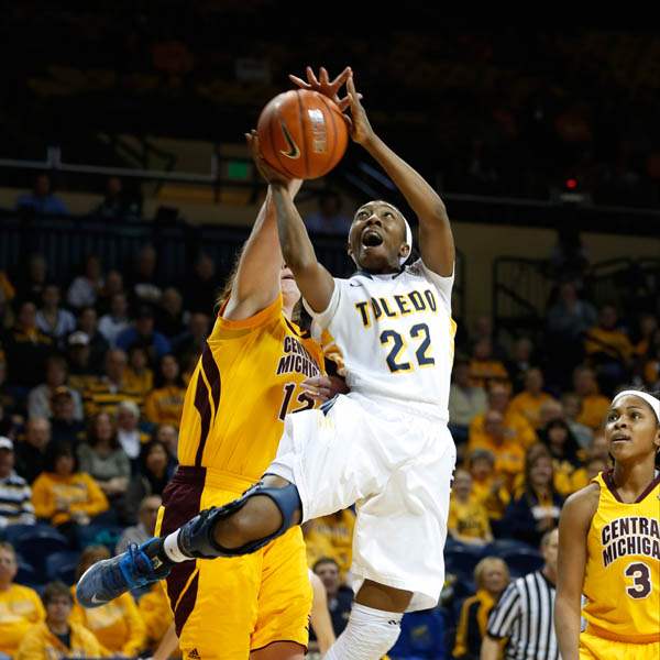 Toledo's Inma Zanoguera shoots while defended by CMU's Crystal Bradford. UT's Sophie Reecher is at right.