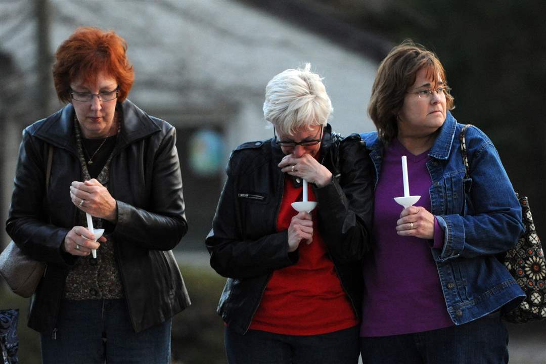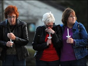 From left, Ruth Greer, of Monroeville, Barb Stuffer, of Penn Township, and Joan Smeltzer, of Latrobe, stand across the street from Franklin Regional High School as church goers and community members have a candlelight vigil and prayer service.