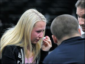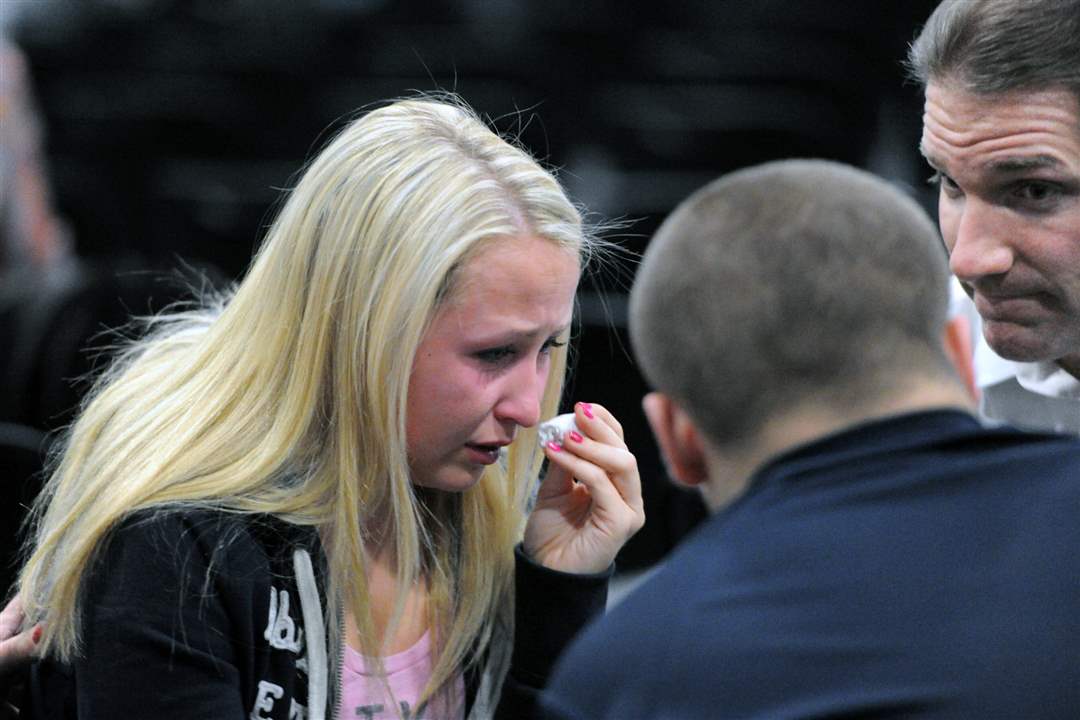 Katie Kimmich, left, 16, sophomore from FR witnessed much of the tragedy is counceled by Pastor Brian Smith, right,from Cornerstone, after service in Export.
