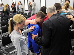 Prayer service in response to the Franklin Regional stabbings was held at Cornerstone Ministries Warehouse and Gym where about 400 attended, many students and families from the school district. Pastor Donn Chapman, right, prayers with friends of two of the more severly wounded students.
