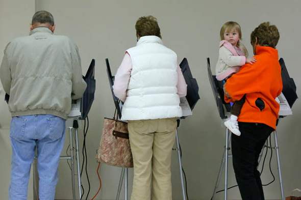 Nancy Rank holds her 22-month old great-granddaughter Quinn O'Connor as she casts her ballot at Our Lady of Perpetual Hope in South Toledo.