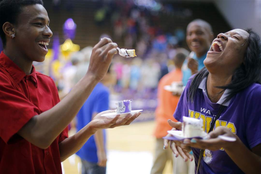 Daveon Lofton, left, has a laugh with fellow sophomore Dajanay Wells as he offers to feed her cake.