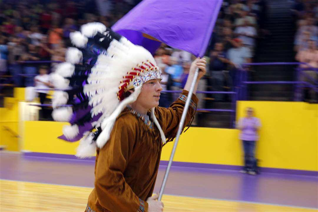 Waite Indian mascot Jason Kendall, a junior at the school, races through the Grant Murray Field House carrying the school's flag.