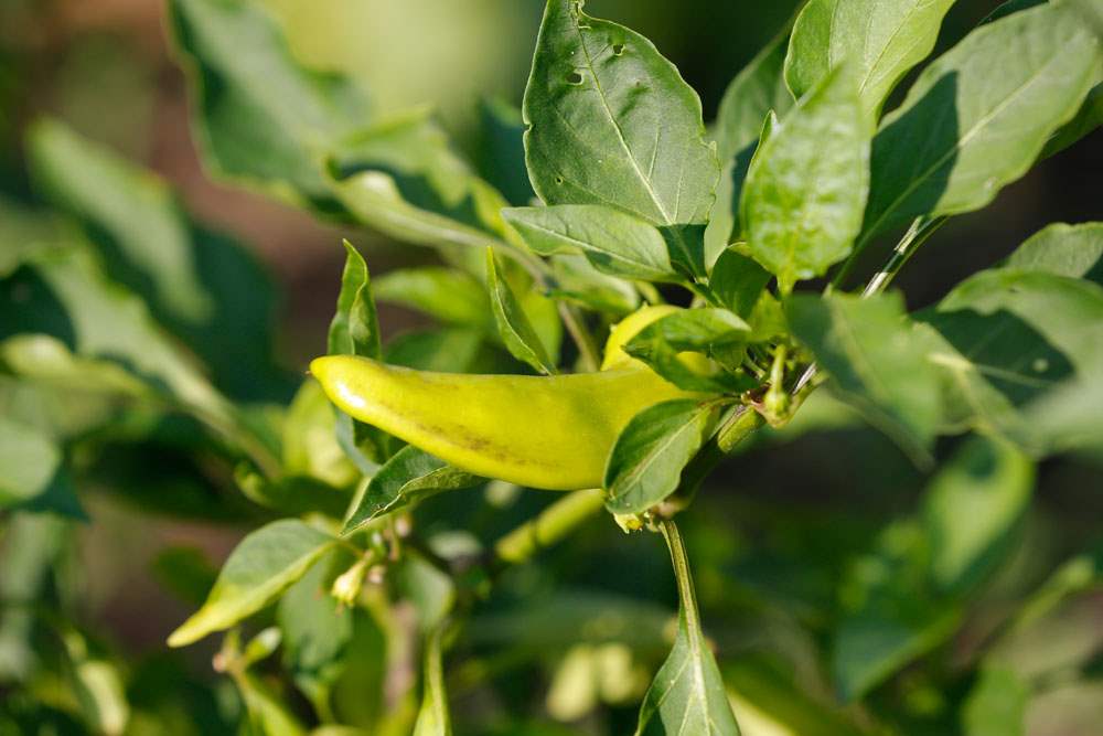 A pepper grows in a planting box.