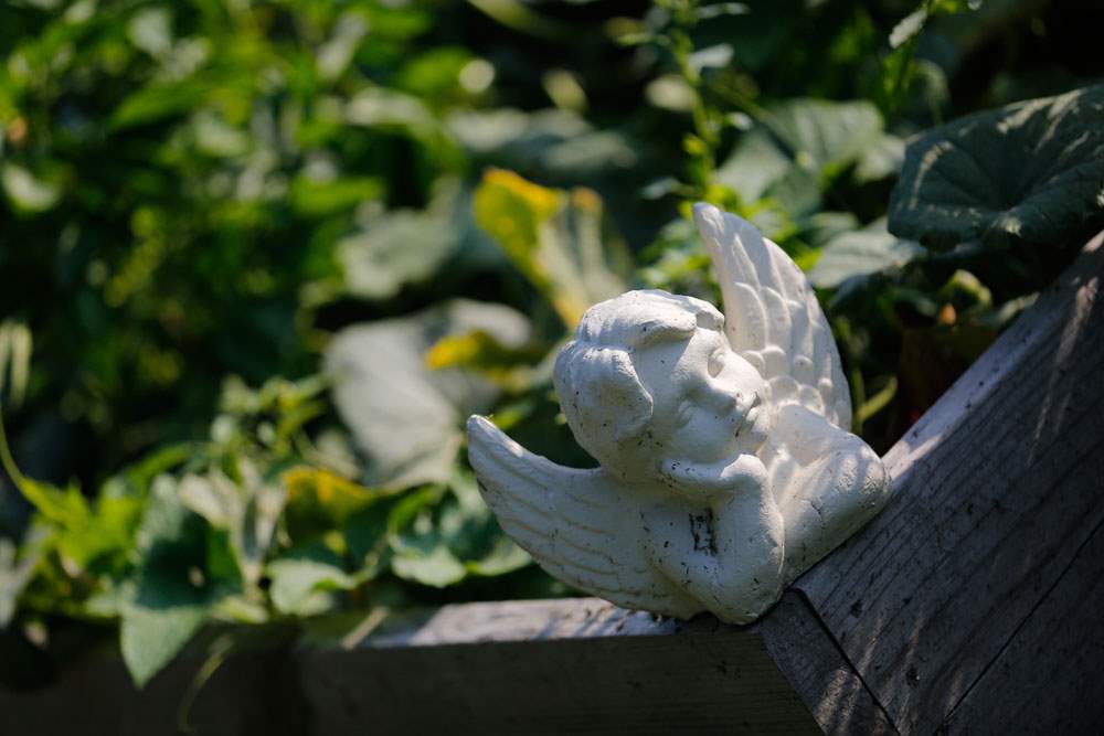 A statue rests in a planting box.