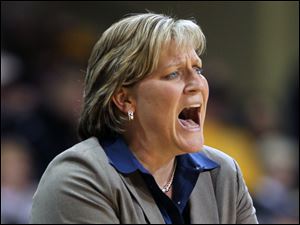 Toledo coach Tricia Cullop shouts instructions to her players as the game against Ball State heats up.
