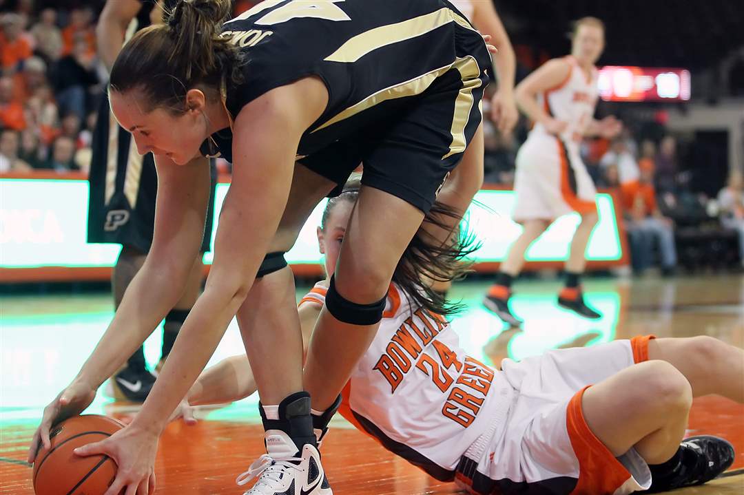 Bowling Green guard Jessica Slagle (14) battles Purdue guard KK Houser (22) for a loose ball.
