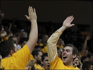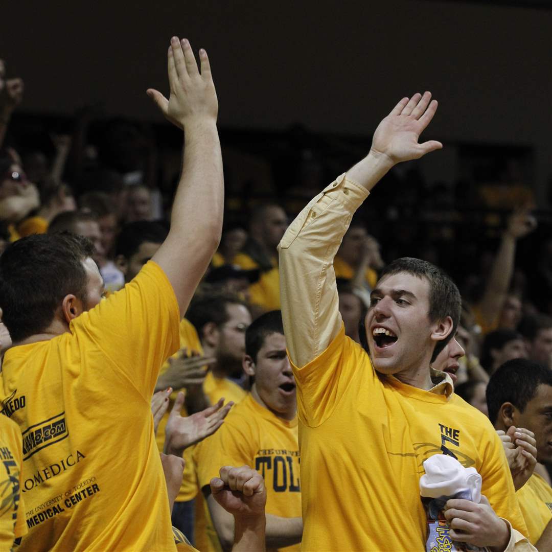 Toledo student John Gaspar, right, high-fives a fellow UT student after the Rockets score against USC.