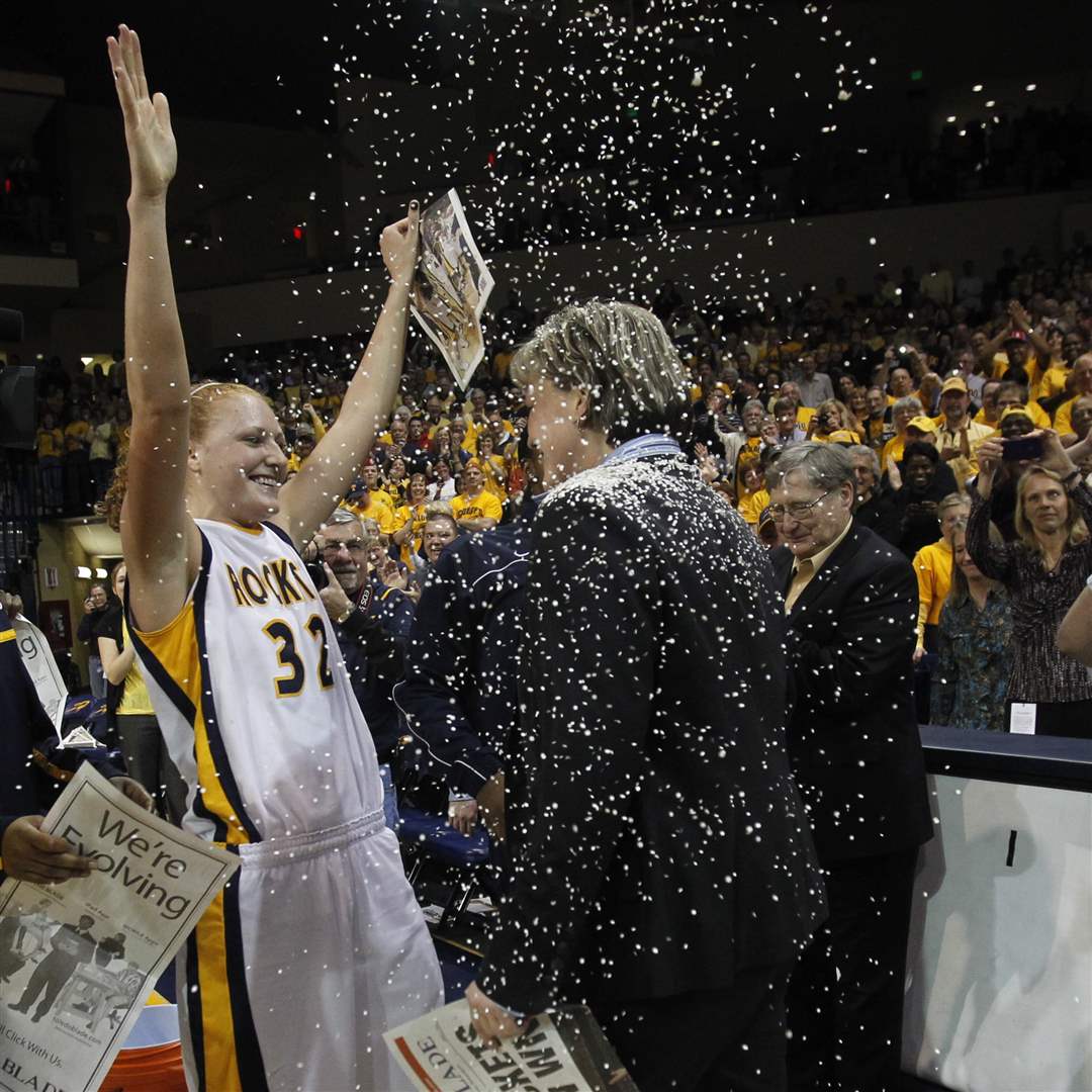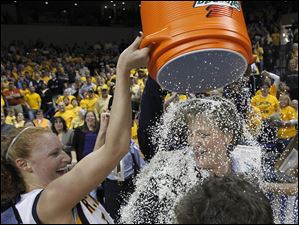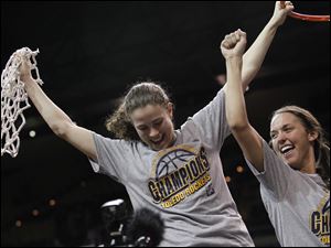 Toledo's Naama Shafir holds the net after Courtney Ingersoll cut it down for her, after UT defeated USC to win the WNIT championship.