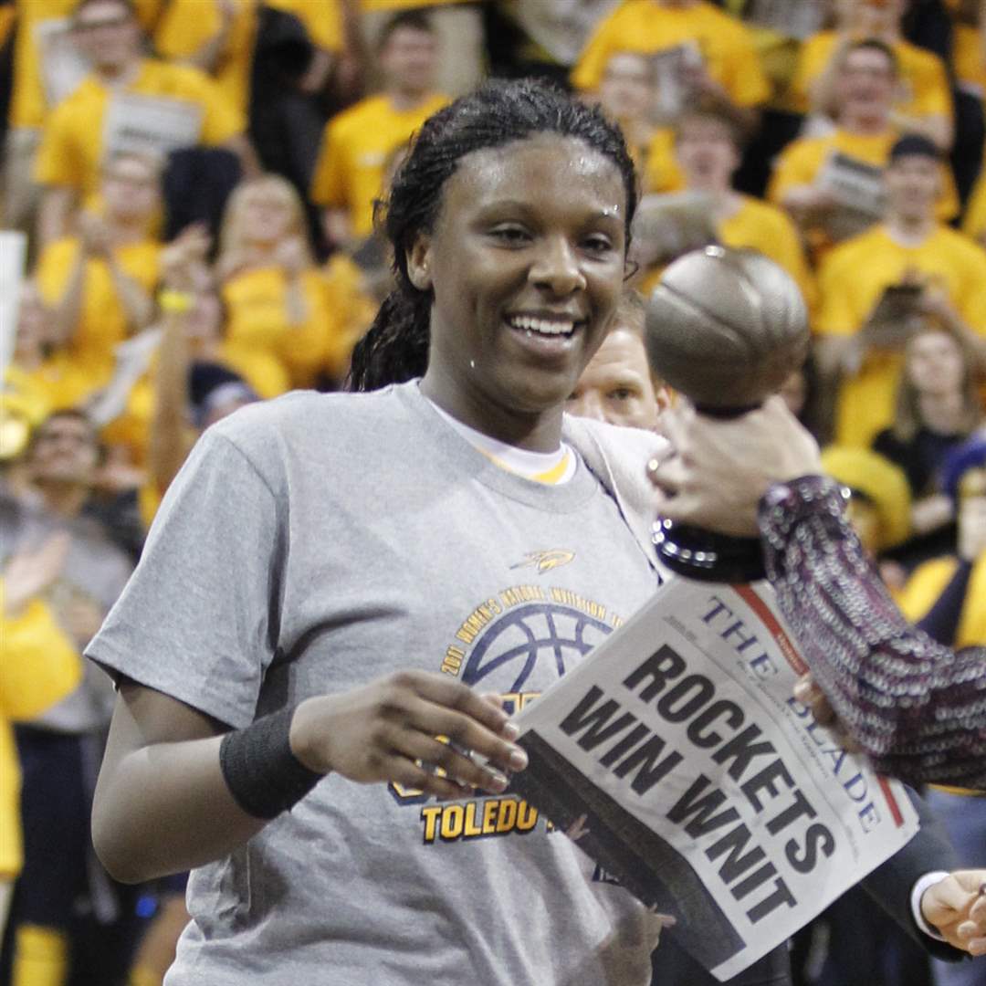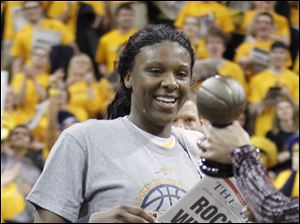 Toledo's Yolanda Richardson is handed her trophy for earning the all-tourney team after the Rockets defeated USC to win the WNIT championship.
