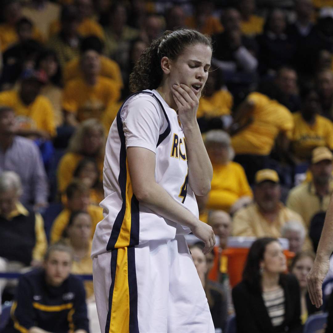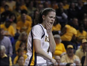 Toledo's Naama Shafir holds her chin after being elbowed by a USC player.