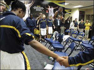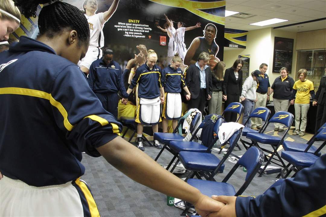 UT players pray in their locker room prior to the game against USC for the WNIT championship game Saturday at Savage Arena. Toledo won 76-68.