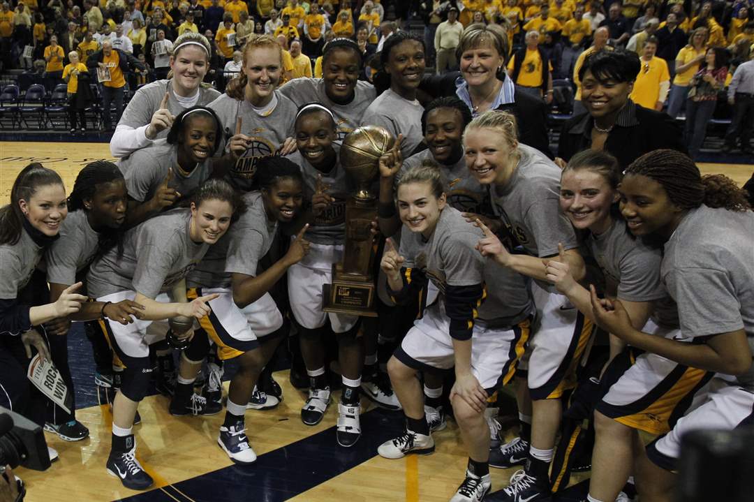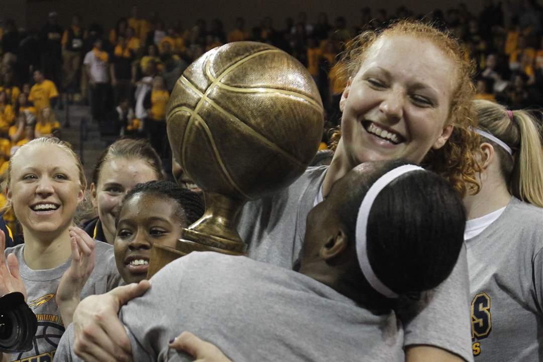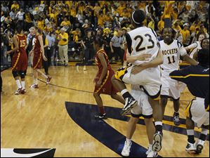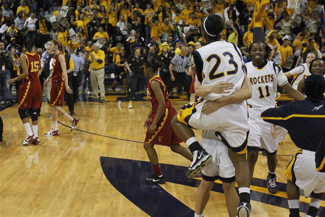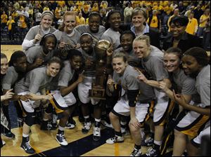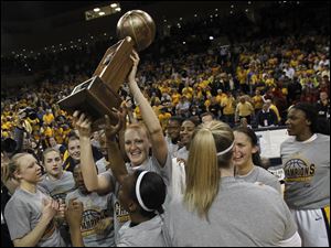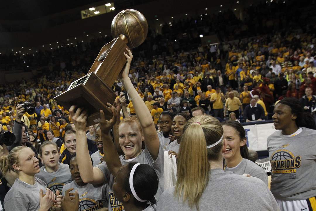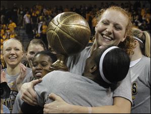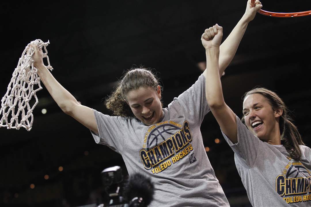 University of Toledo players celebrates their victory over USC to claim the WNIT championship game Saturday at Savage Arena.