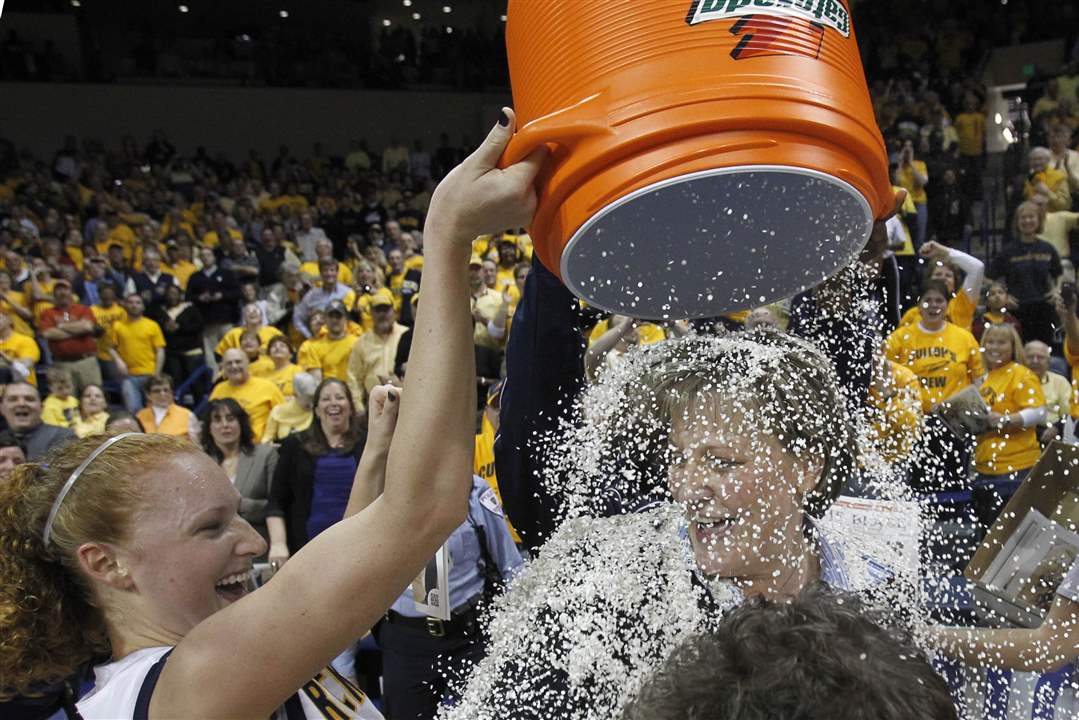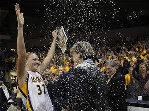 UT's Melissa Goodall dumps confetti on coach Tricia Cullop after they defeated USC to win the WNIT championship.