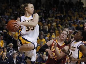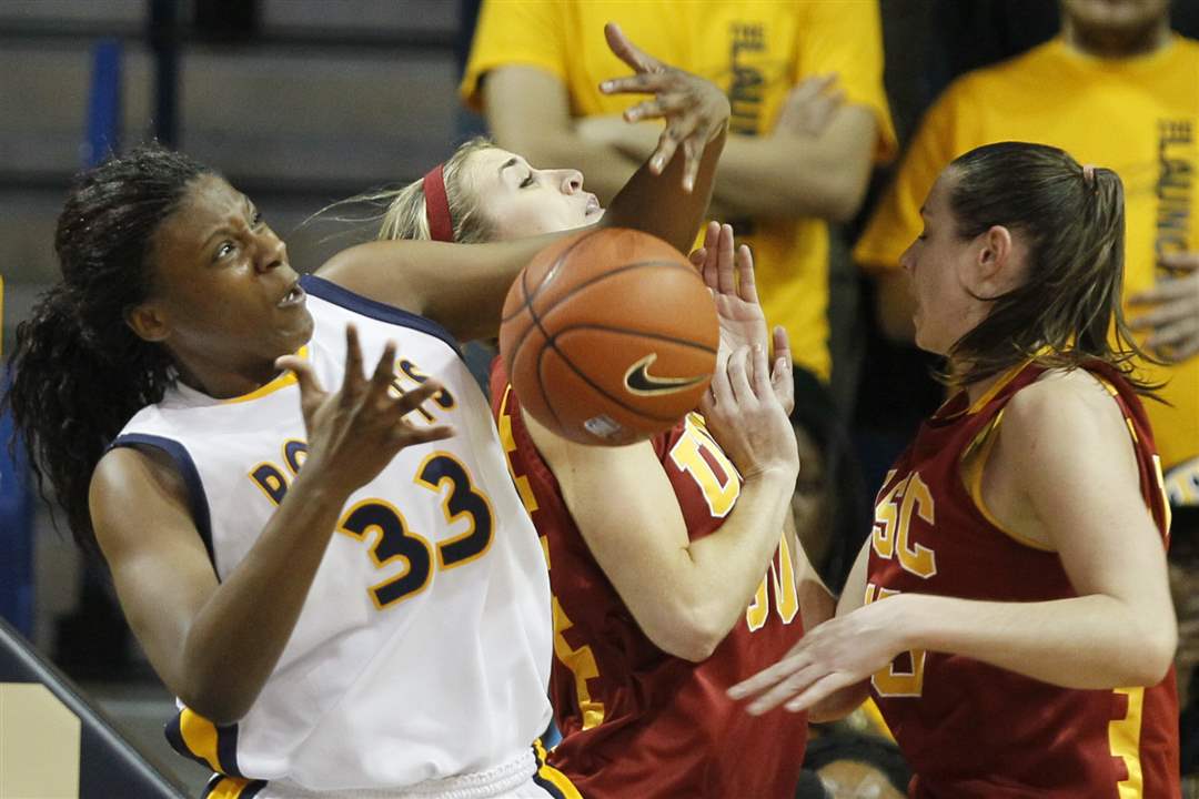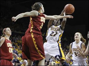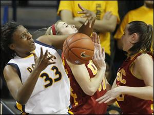 Toledo's Yolanda Richardson (33) grabs a rebound against USC's Christina Marinacci (00) and Kari LaPlante (13).