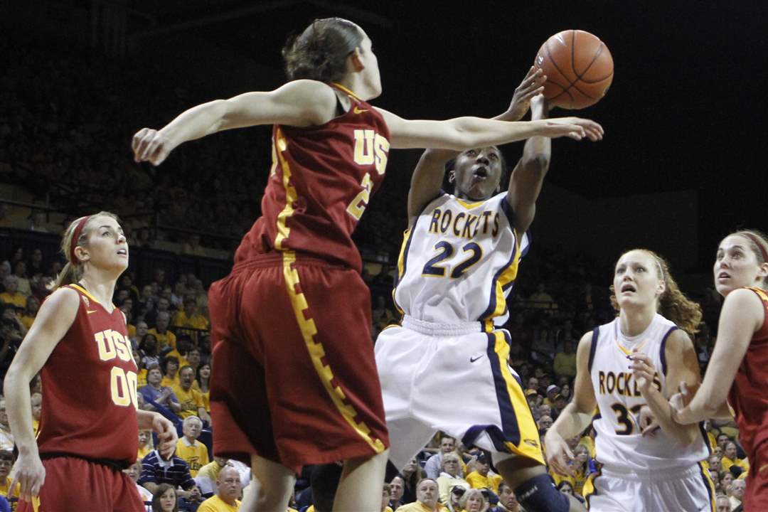 Toledo's Andola Dortch (22) goes to the net against USC's Jacki Gemelos (23).