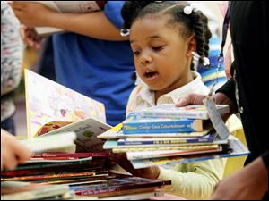 Samere Harton, 6, chooses a book from a llarge stack of books during a party to celebrate the end of a successful first year of WordShop, a creative writing program developed by the Women's Initiative of United Way, at Rosary Cathedral School on May 23, 2013.
