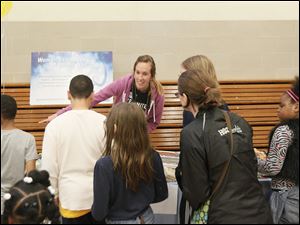 Tami Duvall, center, an intern with the United Way, helps a group of kids choose free books to take home.