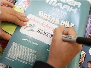 Ronald Gordon, 9, puts his name in the book that he chose to take home.