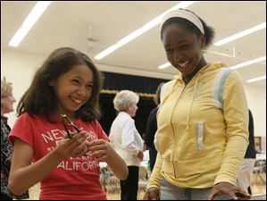 Angelica Torres, 11, left, and LaNia Sanders, 11, right, choose free books to take home.