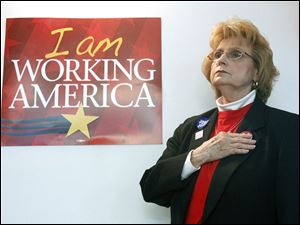 Karen Krause, with Toledo Area Jobs with Justice, joins the crowd for the Pledge of Allegiance at the UAW Local 14 hall during a "We Are One" rally.