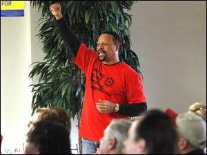 Ray Wood, president of UAW Local 14, yells out to the crowd at the union hall during a "We Are One" rally in conjunction with the 43rd anniversary of Martin Luther King Jr.'s assassination.