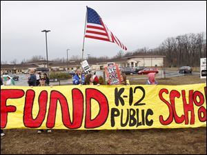 Members of the Bedford Education Association conduct an informational picket outside Monroe Road Elementary School in Lambertville, Mich. The teachers union was protesting proposed education funding cuts in the state budget.