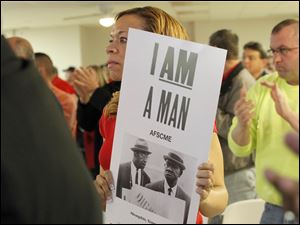Darlene Blakely, from Sylvania, stands up and applauds for teachers' rights at the UAW Local 14 hall during a "We Are One" rally.