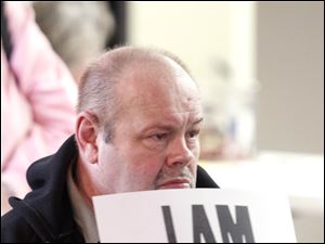 Paul Wohlfarth, with UAW Local 12, holds a sign at the back of a standing-room only rally at the UAW Local 14.