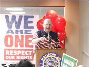 Ray Wood, president of UAW Local 14, speaks to the crowd at the UAW Local 14 hall.